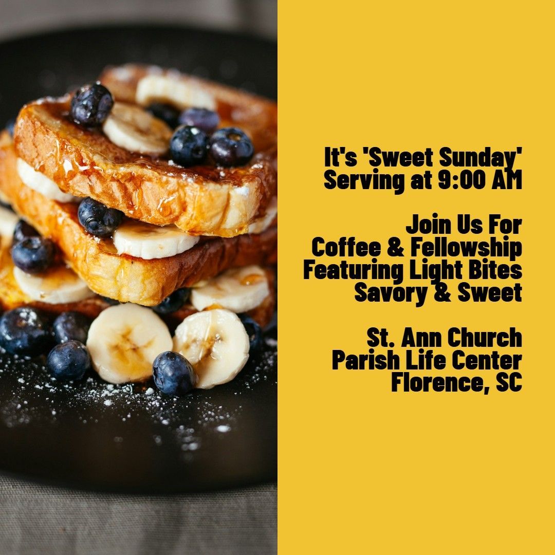 Catch up with everyone you've missed over the past several weeks! Meet some parishioners--they may attend a different Mass time--or folks looking for a new parish family here at St. Ann's!. Share the good news of the Gospel today over a freshly brewed cup of coffee, juice and home-baked goodness--all light ''sweet & savory bites'--not quite a full breakfast, maybe a light brunch, but definitely a great opportunity for fellowship that begs you to drop in to experience St. Ann's long standing 'Sweet Sunday' traditions!