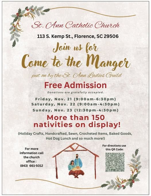 Members of our St. Ann's Cursillo, both men's and women's groups, will meet this Tuesday, August 5th, 2025 at 10:00 AM on the parish campus of St. Ann Catholic Church, located at 113 South Kemp Street, Florence, SC