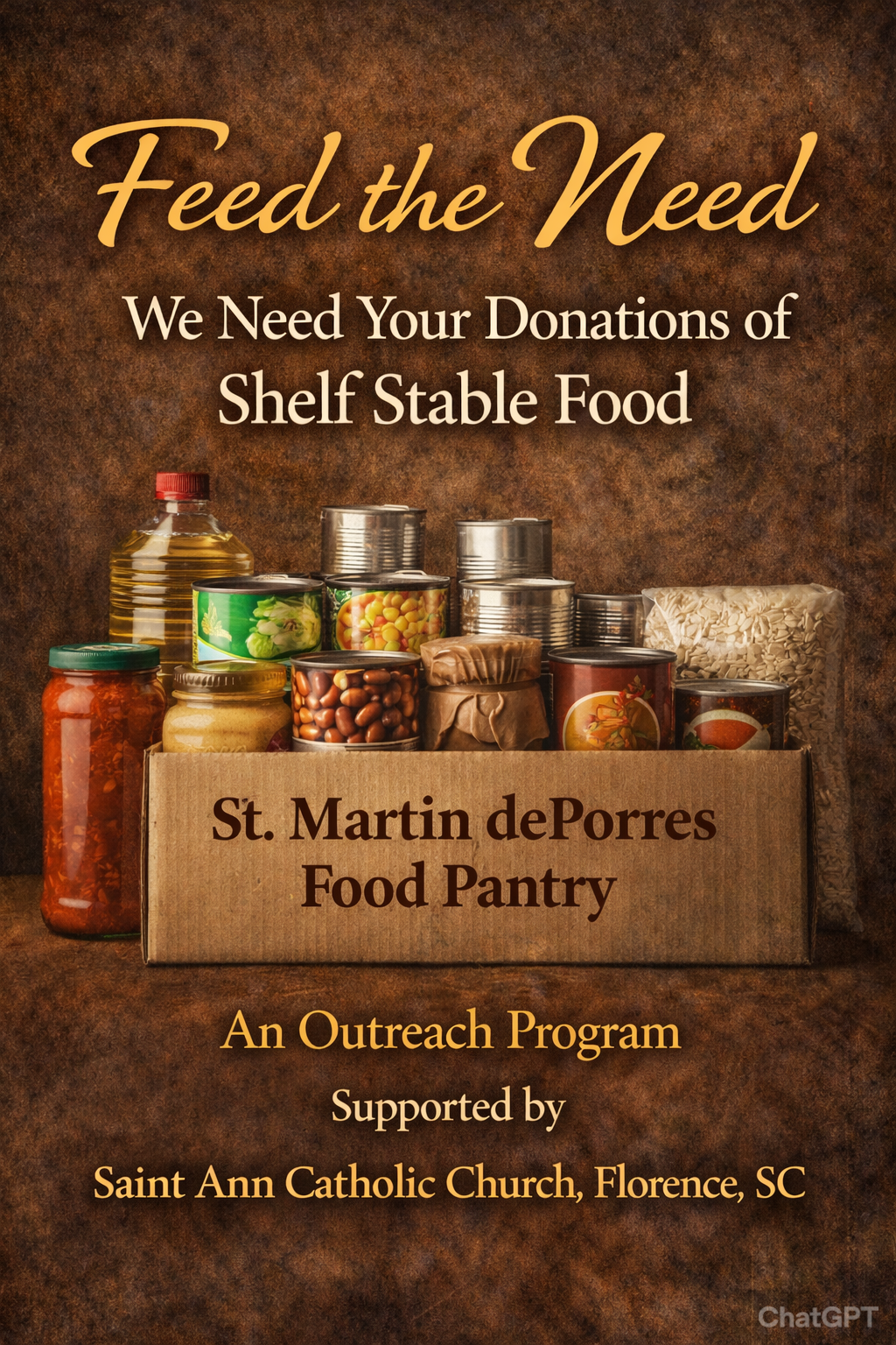 Donations of non-perishable foods items to the church may be dropped off to the St. Ann Parish Office during business hours, Mon-Fri. 8:00 AM - 4:00 PM or before any scheduled Mass.